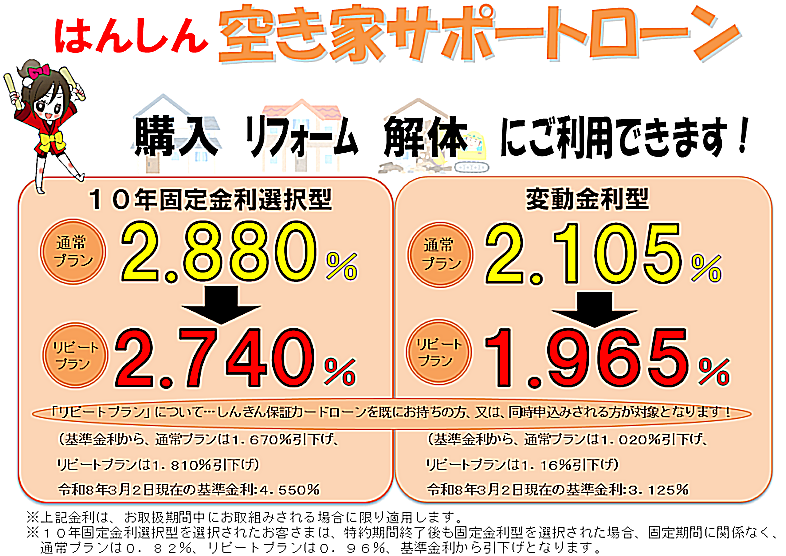 ※10年固定金利選択型を選択されたお客さまは、特約期間終了後も固定金利型を選択された場合、固定期間に関係なく、通常プランは0.82%、リピートプランは0.96%、基準金利から引下げとなります。